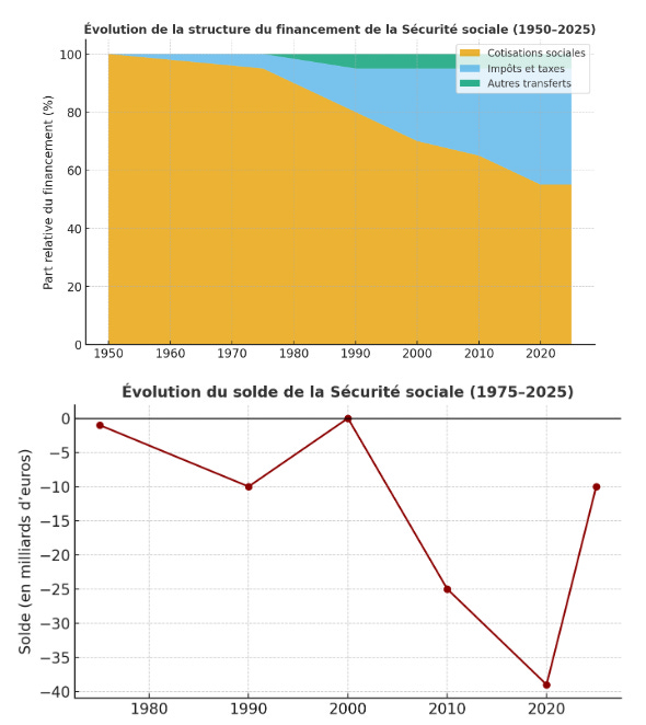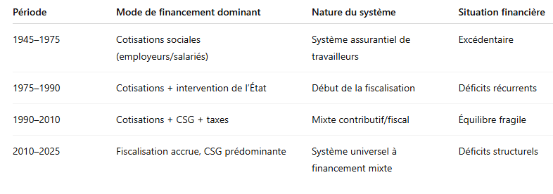 A sa naissance en 45, la sécu est un système bismarckien : la sécu est une assurance vieillesse et une assurance maladie financée entièrement par les cotisations des travailleurs, qui leurs ouvrent des droits. La sécu est gérée paritairement par les syndicats salariés et patronaux. Rapidement, le système devient universel, avec l’ajout de prestations non contributives dans les années 70, mais la forte croissance des 30 Glorieuses permet au système de tenir. Le système s’enraille à partir de 1975 avec les premiers déficits.